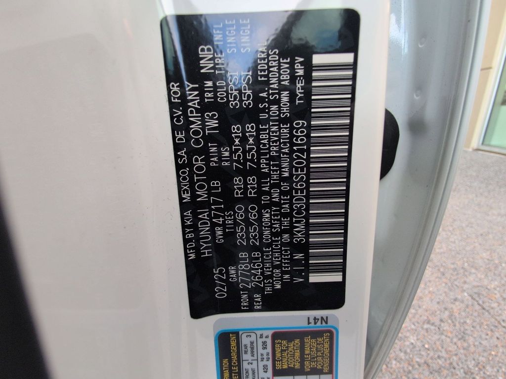 Option Group 01, 18" Alloy Wheels, 4-Wheel Disc Brakes, 6 Speakers, ABS brakes, Air Conditioning, Alloy wheels, AM/FM radio: SiriusXM, Apple CarPlay & Android Auto, Auto High-beam Headlights, Auto-dimming Rear-View mirror, Automatic temperature control, Brake assist, Bumpers: body-color, Carpeted Floor Mats, Delay-off headlights, Driver door bin, Driver vanity mirror, Dual front impact airbags, Dual front side impact airbags, Electronic Stability Control, Emergency communication system: Bluelink+, Four wheel independent suspension, Front anti-roll bar, Front Bucket Seats, Front Center Armrest, Front dual zone A/C, Front reading lights, Fully automatic headlights, H-Tex Seat Trim, Heated door mirrors, Heated Front Bucket Seats, Heated front seats, Illuminated entry, Leather steering wheel, Low tire pressure warning, Navigation System, Occupant sensing airbag, Outside temperature display, Overhead airbag, Overhead console, Panic alarm, Passenger door bin, Passenger vanity mirror, Power door mirrors, Power driver seat, Power Liftgate, Power moonroof, Power steering, Power windows, Radio data system, Radio: AM/FM/HD Audio System, Rear anti-roll bar, Rear reading lights, Rear seat center armrest, Rear side impact airbag, Rear window defroster, Rear window wiper, Remote keyless entry, Security system, Side Steps, Speed control, Split folding rear seat, Spoiler, Steering wheel mounted audio controls, Tachometer, Telescoping steering wheel, Tilt steering wheel, Traction control, Trip computer, Turn signal indicator mirrors, and Variably intermittent wipers.