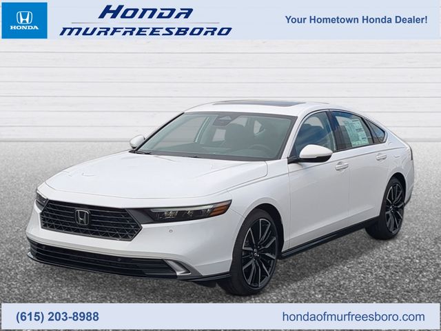 The 2026 Honda Accord Hybrid Touring is the pinnacle of efficiency, technology, and upscale comfort, making it an outstanding choice for drivers across Middle Tennessee who want premium performance with exceptional fuel economy. Its advanced two-motor hybrid powertrain delivers smooth acceleration and impressive MPG ratings, perfect for daily commutes through Murfreesboro or longer drives to Nashville, Franklin, and beyond. Designed by Honda Motor Co., the Hybrid Touring trim adds luxury features like leather-trimmed seating, a premium Bose sound system, a large touchscreen with built-in Google integration, wireless Apple CarPlay and Android Auto, and a head-up display for enhanced driver awareness. Honda Sensing safety technologies come standard, including Blind Spot Information, Adaptive Cruise Control, and Collision Mitigation Braking, providing added peace of mind on busy Tennessee highways. With its sleek styling, refined interior, and outstanding hybrid efficiency, the 2026 Honda Accord Hybrid Touring is a top-tier sedan available at Honda of Murfreesboro, proudly serving drivers throughout the Middle TN region.