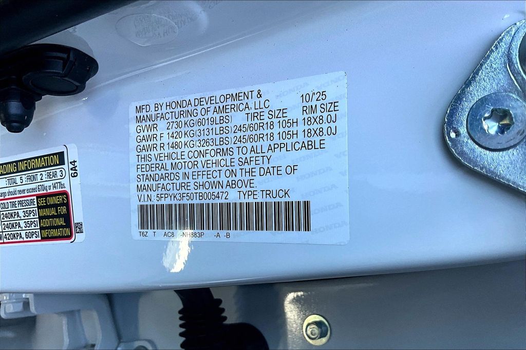 Platinum White Pearl 2026 Honda Ridgeline RTL AWD 9-Speed Automatic 3.5L V6 SOHC i-VTEC 24V