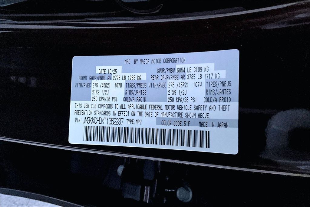 12 Speakers, 2nd-Row Captain's Chairs, 3rd row seats: bench, 4-Wheel Disc Brakes, ABS brakes, Air Conditioning, Alloy wheels, AM/FM radio: SiriusXM, Artisan Red Premium Paint Charge, Auto High-beam Headlights, Auto-dimming door mirrors, Auto-dimming Rear-View mirror, Automatic temperature control, Black Liftgate Garnish, Brake assist, Bumpers: body-color, Cargo Blocks, Compass, Delay-off headlights, Driver door bin, Driver vanity mirror, Dual front impact airbags, Dual front side impact airbags, E911 Automatic Emergency Notification, Electronic Stability Control, Emergency communication system: MAZDA CONNECT, Exterior Parking Camera Rear, Four wheel independent suspension, Front anti-roll bar, Front Bucket Seats, Front Center Armrest w/Storage, Front dual zone A/C, Front reading lights, Fully automatic headlights, Garage door transmitter: HomeLink, Heads-Up Display, Heated door mirrors, Heated front seats, Heated rear seats, Heated steering wheel, Heated/Ventilated Front Bucket Seats, Illuminated entry, Infotainment System Voice Command, Knee airbag, Leather Seat Trim, Leather Shift Knob, Leather steering wheel, Low tire pressure warning, Mazda Connected Services, Mazda Online Navigation, Memory seat, Navigation system: MAZDA CONNECT, Occupant sensing airbag, Outside temperature display, Overhead airbag, Overhead console, Panic alarm, Passenger door bin, Passenger vanity mirror, Power door mirrors, Power driver seat, Power Liftgate, Power moonroof, Power passenger seat, Power steering, Power windows, Radio Broadcast Data System Program Information, Radio data system, Radio: : AM/FM w/HD/Bose 12-Speaker Sound System, Rain sensing wipers, Rear air conditioning, Rear anti-roll bar, Rear reading lights, Rear seat center armrest, Rear window defroster, Rear window wiper, Remote keyless entry, SMS Text Msg Audio Delivery and Reply, Speed control, Speed-sensing steering, Split folding rear seat, Spoiler, Steering wheel mounted audio controls, Tachometer, Telescoping steering wheel, Tilt steering wheel, Traction control, Trip computer, Turn signal indicator mirrors, Variably intermittent wipers, Ventilated front seats, and Wheels: 21" x 9.5J Aluminum Alloy with Black Metal Finish.
