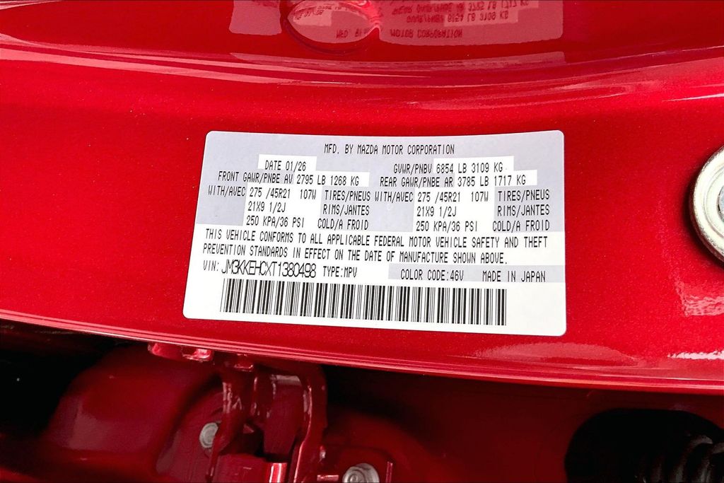 12 Speakers, 3rd row seats: bench, 4-Wheel Disc Brakes, ABS brakes, Air Conditioning, Alloy wheels, AM/FM radio: SiriusXM, Auto High-beam Headlights, Auto-dimming door mirrors, Auto-dimming Rear-View mirror, Automatic temperature control, Brake assist, Bumpers: body-color, Compass, Delay-off headlights, Driver door bin, Driver vanity mirror, Dual front impact airbags, Dual front side impact airbags, E911 Automatic Emergency Notification, Electronic Stability Control, Emergency communication system: MAZDA CONNECT, Four wheel independent suspension, Front anti-roll bar, Front Bucket Seats, Front Center Armrest w/Storage, Front dual zone A/C, Front reading lights, Fully automatic headlights, Garage door transmitter: HomeLink, Heads-Up Display, Heated door mirrors, Heated front seats, Heated rear seats, Heated steering wheel, Heated/Ventilated Front Bucket Seats, Illuminated entry, Infotainment System Voice Command, Knee airbag, Leather Shift Knob, Leather steering wheel, Low tire pressure warning, Mazda Connected Services, Mazda Online Navigation, Memory seat, Nappa Leather Seat Trim, Navigation system: MAZDA CONNECT, Occupant sensing airbag, Outside temperature display, Overhead airbag, Overhead console, Panic alarm, Passenger door bin, Passenger vanity mirror, Power door mirrors, Power driver seat, Power Liftgate, Power moonroof, Power passenger seat, Power steering, Power windows, Radio Broadcast Data System Program Information, Radio data system, Radio: : AM/FM w/HD/Bose 12-Speaker Sound System, Rain sensing wipers, Rear air conditioning, Rear anti-roll bar, Rear reading lights, Rear seat center armrest, Rear window defroster, Rear window wiper, Remote keyless entry, Security system, SMS Text Msg Audio Delivery and Reply, Soul Red Crystal Metallic Paint Charge, Speed control, Speed-sensing steering, Split folding rear seat, Spoiler, Steering wheel memory, Steering wheel mounted audio controls, Tachometer, Telescoping steering wheel, Tilt steering wheel, Traction control, Trip computer, Turn signal indicator mirrors, Variably intermittent wipers, Ventilated front seats, Ventilated rear seats, and Wheels: 21" x 9.5j Machine Cut Aluminum Alloy.