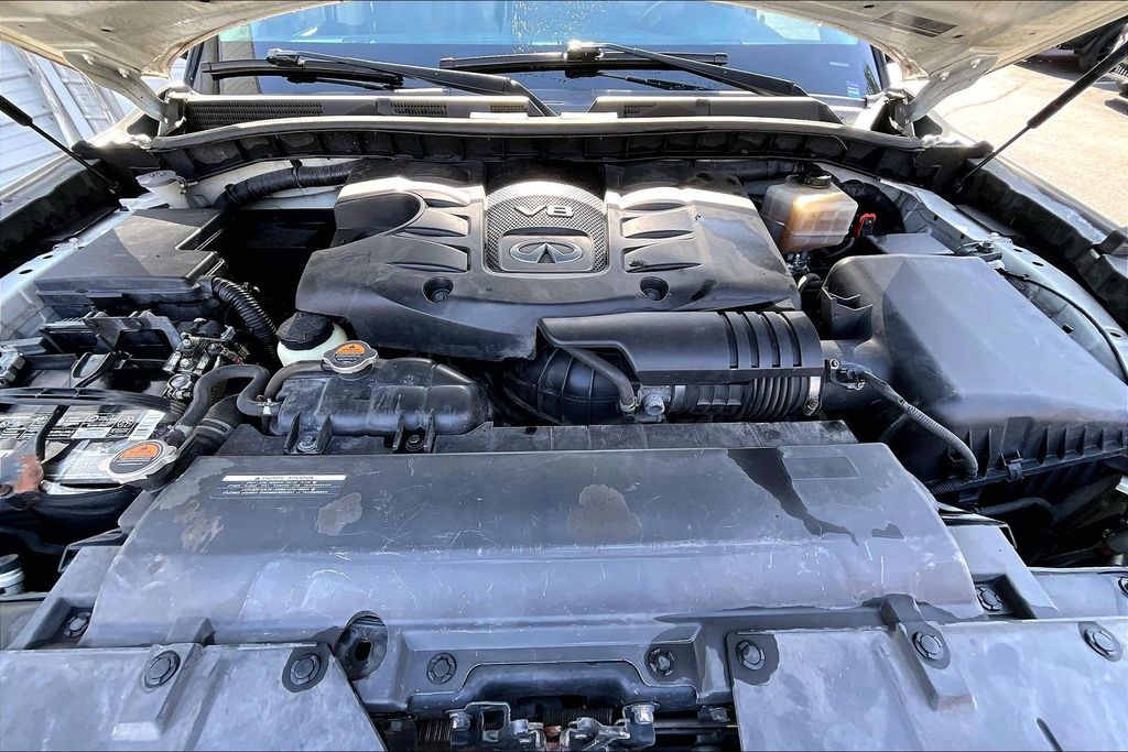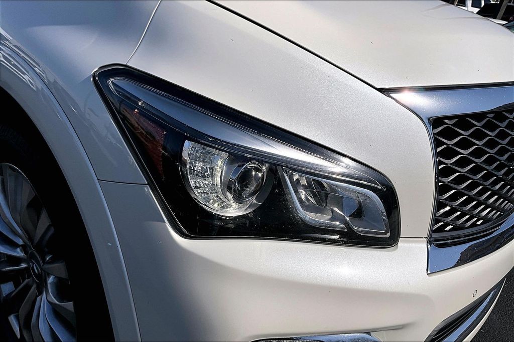 22" Tire & Wheel Package (Wheels: 22" x 8.0" 14-Spoke Forged Aluminum-Alloy), All Season Package (All Season Floor Mats and Cargo Protector), Driver Assistance Package (Backup Collision Intervention (BCI), Blind Spot Intervention (BSI), Blind Spot Warning, Intelligent Cruise Control (Full-Speed Range), and Lane Departure Warning System), Theater Package (120V Power Outlet, Dual 7" Color Monitors, Heated 2nd-Row Seats, and Wireless Headphones (2)), 13 Speakers, 2.94 Axle Ratio, 3rd row seats: split-bench, 4-Wheel Disc Brakes, ABS brakes, Air Conditioning, Alloy wheels, AM/FM radio: SiriusXM, Anti-whiplash front head restraints, Auto High-beam Headlights, Auto tilt-away steering wheel, Auto-dimming door mirrors, Auto-dimming Rear-View mirror, Auto-leveling suspension, Automatic temperature control, Bose Premium Sound System, Brake assist, Bumpers: body-color, Carpeted Cargo Mat/Cargo Net & First Aid Kit, CD player, Delay-off headlights, Driver door bin, Driver vanity mirror, Dual front impact airbags, Dual front side impact airbags, Electronic Stability Control, Emergency communication system: INFINITI Connection, Four wheel independent suspension, Front anti-roll bar, Front Bucket Seats, Front Center Armrest, Front dual zone A/C, Front fog lights, Front reading lights, Fully automatic headlights, Garage door transmitter: HomeLink, Genuine wood console insert, Genuine wood dashboard insert, Genuine wood door panel insert, Heated door mirrors, Heated Front Bucket Seats, Heated front seats, Heated steering wheel, Illuminated entry, Leather Shift Knob, Leather steering wheel, Leather-Appointed Seats w/Mocha Burl Trim, Low tire pressure warning, Memory seat, Navigation System, Occupant sensing airbag, Outside temperature display, Overhead airbag, Overhead console, Panic alarm, Passenger door bin, Passenger vanity mirror, Power door mirrors, Power driver seat, Power Liftgate, Power moonroof, Power passenger seat, Power steering, Power windows, Radio data system, Rain sensing wipers, Rear air conditioning, Rear anti-roll bar, Rear audio controls, Rear reading lights, Rear seat center armrest, Rear window defroster, Rear window wiper, Reclining 3rd row seat, Remote keyless entry, Roof rack: rails only, Roof Rail Crossbars, Security system, Speed control, Speed-sensing steering, Split folding rear seat, Spoiler, Steering wheel memory, Steering wheel mounted audio controls, Tachometer, Telescoping steering wheel, Tilt steering wheel, Traction control, Trip computer, Turn signal indicator mirrors, Variably intermittent wipers, Voltmeter, and Wheels: 20" x 8.0" Split 6-Spoke Aluminum-Alloy.