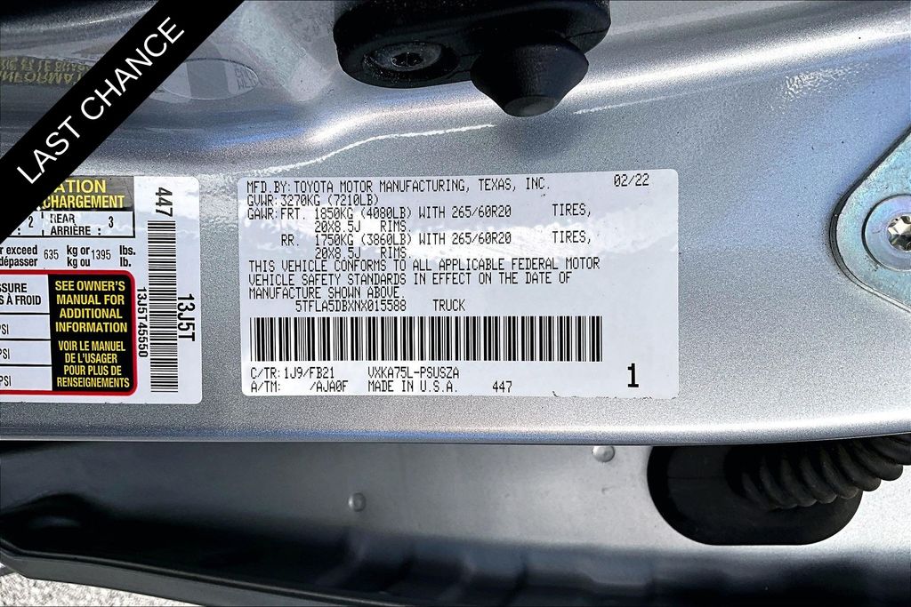 ****PRICE INCLUDES a $1000 finance coupon does not include processing fee of $799 and tt&l**** Bristol Honda locally owned and operated right here in beautiful Bristol, TN. At Bristol Honda, we hold our employees to the highest standards of customer service. We strive to delight each customer during every interaction. When our customers walk through the doors of Bristol Honda, they are not only immediately impressed with the friendliness of the staff, but they are instantly aware that they have entered a store that values high standards, premier designs, and the latest technology. We serve Bristol, Johnson City, Kingsport, Southwest Virginia and even North Carolina and Kentucky! For your next used or new car or truck, visit us at www.bristolhonda.com SR5 Convenience Package (32 Gallon Fuel Tank, Blind Spot Monitor w/Lane Change Assist, and Parking Support Alert/Brake), TRD 20" Matte Black Wheel Package (TMS), 4WD, Boulder w/Fabric Seat Trim or SofTex Seat Trim, 18" Alloy Wheels, 3.31 Axle Ratio, 4-Way Adjustable Front Bucket Seats, 4-Wheel Disc Brakes, 9 Speakers, ABS brakes, Air Conditioning, Alloy wheels, AM/FM radio: SiriusXM, Apple CarPlay/Android Auto, Auto High-beam Headlights, Automatic temperature control, Brake assist, Bumpers: body-color, Delay-off headlights, Driver door bin, Driver vanity mirror, Dual front impact airbags, Dual front side impact airbags, Electronic Stability Control, Emergency communication system: Safety Connect with 1-year trial, Exterior Parking Camera Rear, Fabric Seat Trim, Front anti-roll bar, Front Bucket Seats, Front Center Armrest, Front fog lights, Front reading lights, Front wheel independent suspension, Fully automatic headlights, Heated door mirrors, Illuminated entry, Knee airbag, Low tire pressure warning, Occupant sensing airbag, Outside temperature display, Overhead airbag, Overhead console, Panic alarm, Passenger door bin, Passenger vanity mirror, Power door mirrors, Power steering, Power windows, Radio data system, Radio: Audio Multimedia System, Rear reading lights, Rear step bumper, Rear window defroster, Remote keyless entry, Safety Connect, Security system, Speed control, Speed-sensing steering, Split folding rear seat, Steering wheel mounted audio controls, Tachometer, Telescoping steering wheel, Tilt steering wheel, Traction control, Trip computer, Turn signal indicator mirrors, Variably intermittent wipers, and VoltmeteR.